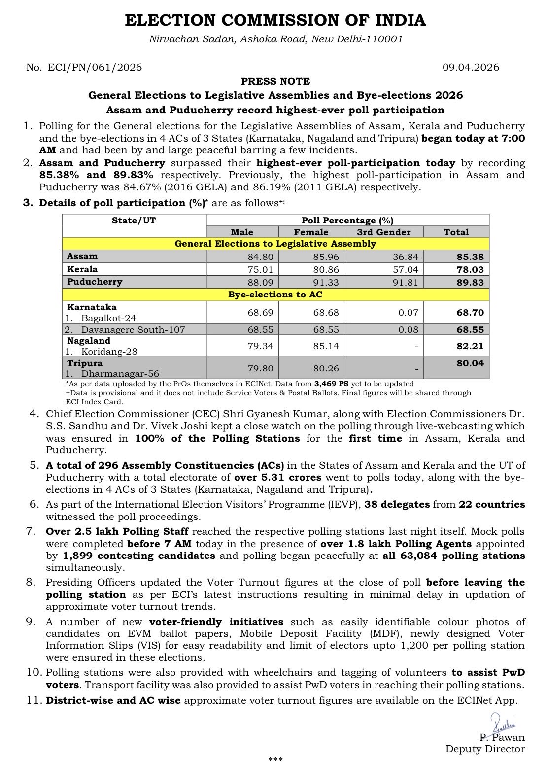 असम, केरलम और पुडुचेरी में 9 अप्रैल 2026 को विधानसभा चुनाव के लिए वोटिंग पूरा हुआ। चुनाव आयोग के शाम 6 बजे तक के आंकड़ों के अनुसार असम में करीब 85.04% मतदान हुआ है जो राज्य के इतिहास में सबसे ज्यादा है। इस चुनाव में महिलाओं की संख्या भी ज़्यादा देखने को मिली है।
