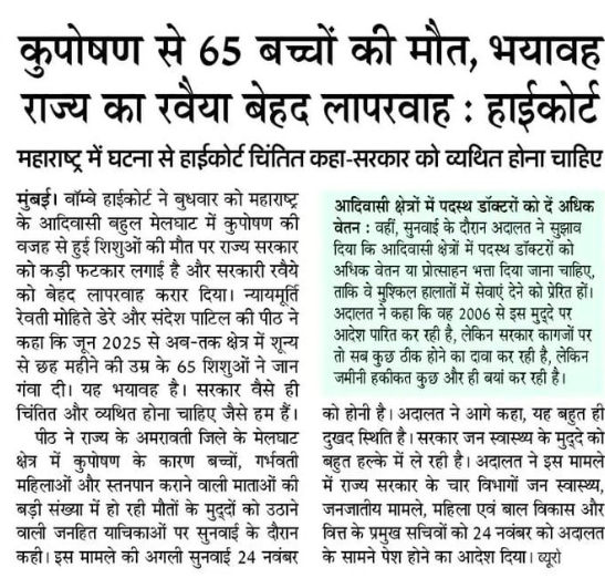 मेलघाट और अन्य आदिवासी क्षेत्रों में लगातार हो रही बच्चों की मौतें महाराष्ट्र में कुपोषण और स्वास्थ्य सेवाओं की वास्तविक स्थिति पर गंभीर सवाल खड़े करती हैं। बॉम्बे हाईकोर्ट के बार-बार दिए गए निर्देशों, चेतावनियों और फटकारों के बावजूद जमीनी हालात में आवश्यक सुधार दिखाई नहीं देता। सरकार के दावों और कागज़ी योजनाओं के विपरीत आदिवासी बस्तियों में बच्चों, गर्भवती महिलाओं और माताओं की मौतों का बढ़ता आंकड़ा बताता है कि प्रशासनिक कार्यवाही अभी भी अधूरी, कमजोर और असंगठित है। सबसे महत्वपूर्ण सवाल यही है कि जब 2006 से लेकर 2021 और अब 2025 तक हाईकोर्ट लगातार आदेश दे रहा है चेतावनी दे रहा है और समाधान सुझा रहा है तो फिर आदिवासी बच्चों की मौतों का यह सिलसिला आखिर क्यों नहीं रुक रहा?