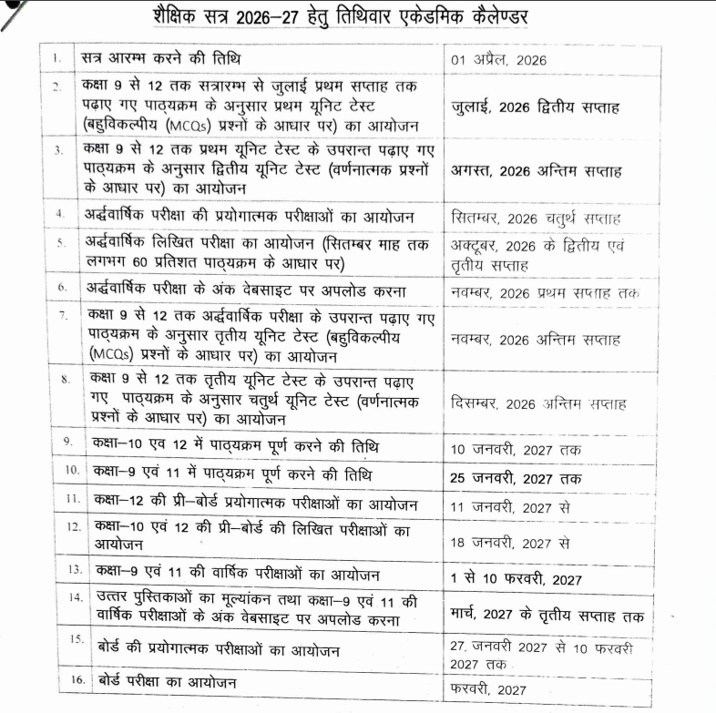 स्कूलों में बच्चों को शिक्षा के साथ-साथ बाकी क्रियाकलापों यानी एक्टिविटी कराई जाती है। वर्त्तमान समय में आधुनिक और डिजिटल होने से बच्चों का ध्यान अधिकतर मोबाइल और गेम्स की ओर रहता है। बच्चे पढ़ाई से दूर भागने लगे हैं और बच्चों को अब पढ़ाई रुचिकर यानी इंटरस्टिंग नहीं लगती है। इस वजह से शिक्षा परिषद ने साल भर में बच्चों को कौन-कौन सी एक्टिविटी करानी है, इन सब के लिए विस्तृत जानकारी कैलंडर में दी गई है। कैलंडर में इस साल 9वीं से 12 वीं कक्षा का नया शैक्षिणक सत्र 1 अप्रैल 2026 से शुरू होगा। इसके बाद जुलाई के दूसरे सप्ताह में पढ़ाए गए पाठ्यकर्म का पहला यूनिट टेस्ट लिया जाएगा। दूसरा यूनिट टेस्ट अगस्त महीने के अंतिम दिनों में लिया जाएगा। कैलंडर के अनुसार टेस्ट और परीक्षा आयोजित की जाए। इस कैलंडर को आप आधिकारिक वेबसाइट https://d3owc5q88bl9q1.cloudfront.net/pdf/annual_calender_2026-27.pdf पर जाकर देख सकतें हैं।