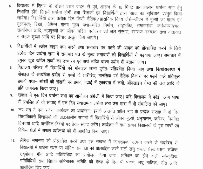 विद्यालय में पढ़ाई शुरू होने से पहले पहले 15 मिनट प्रार्थना सभा होगी। इसमें प्रार्थना, आज का सुविचार और छात्र-शिक्षक द्वारा छोटे-छोटे विचार साझा किए जाएंगे। विद्यार्थियों का स्क्रीन टाइम कम करने और अखबार पढ़ने की आदत बढ़ाने के लिए, रोज़ प्रार्थना सभा में उनसे मुख्य समाचार पढ़वाए जाएं। साथ ही, समाचार के कठिन शब्दों का सही उच्चारण, अर्थ और वाक्य में प्रयोग भी समझाया जाए।