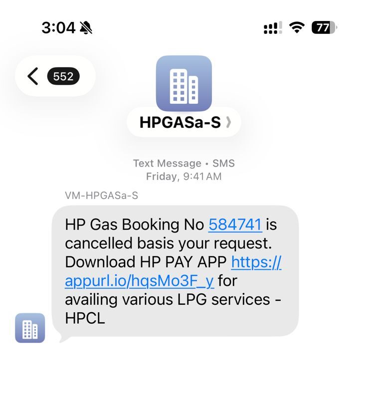 जमीनी स्तर पर लोग गैस की किल्लत से परेशान है। दिल्ली, यूपी, बिहार समेत कई राज्यों में यह समस्या अभी तक बनी हुई है। दिल्ली की रहने वाली प्रिया बताती हैं कि वह तीन हफ़्तों से एलपीजी गैस की बुकिंग कर रही है लेकिन जब वह हिंदुस्तान पेट्रोलियम गैस एजेंसी के नंबर पर कॉल करती हैं तो उन्हें हर बार “सॉरी योर बुकिंग इस नॉट कम्पलीटेड” सुनने को मिलता है। उन्होंने बताया कि पहले बुकिंग सफल हो गई लेकिन बाद में इसे कैंसिल कर दिया गया। आप बुकिंग कैंसिल का मैसेज नीचे दिए गए स्क्रीनशॉट में देख सकते हैं।