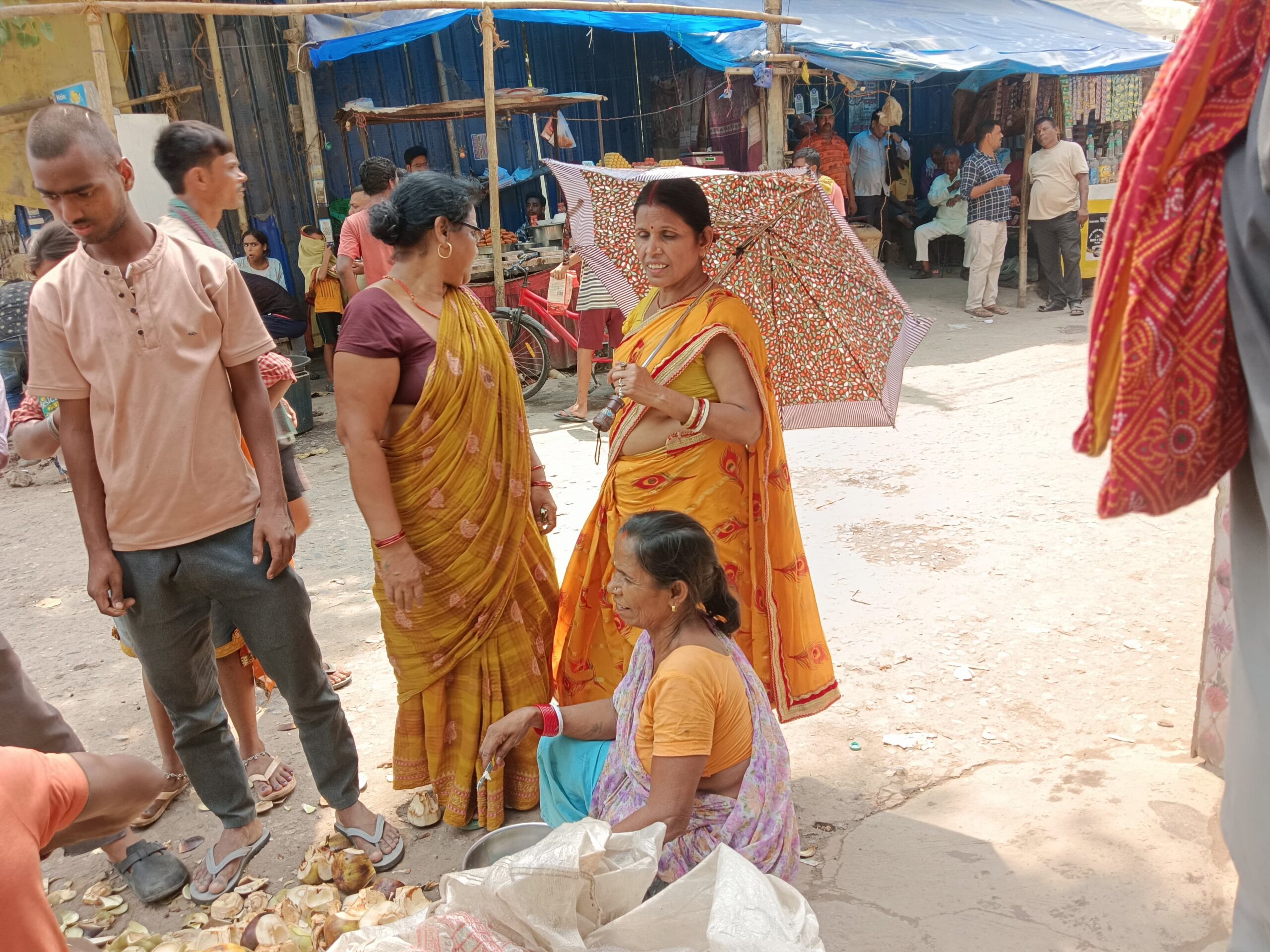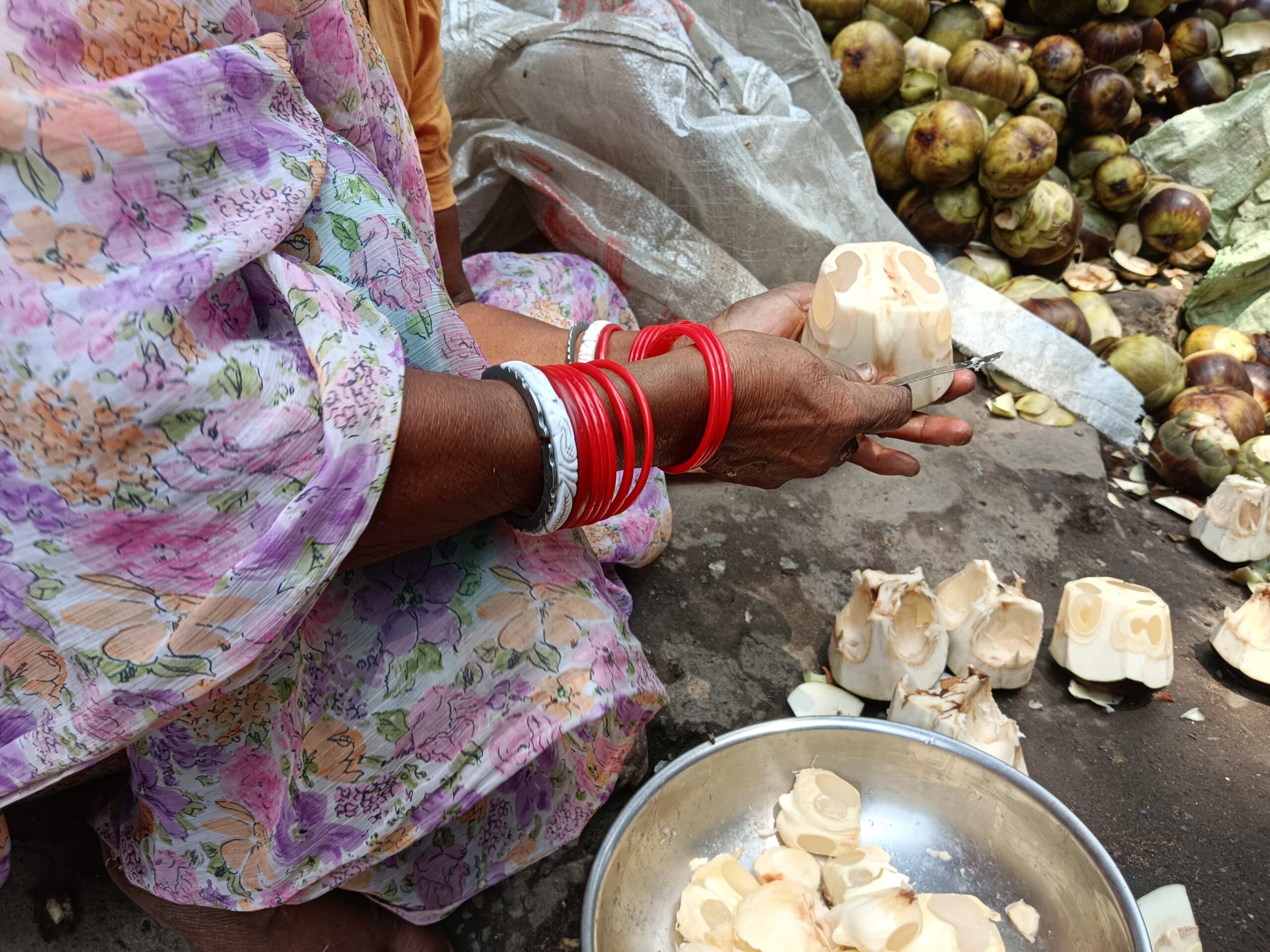 एक लगभग 55-60 साल की महिला हाथ में चाकू लिए हुए फलों से गूदा (पाल) निकाल रही हैं। लोग उन्हें पैसे देकर जल्दी-जल्दी फल देने को कह रहे हैं। जब मैंने उनसे उनका नाम पूछा तो वे मुस्कुराईं और बोलीं, “क्या करोगी बेटा मेरा नाम जानकर?”