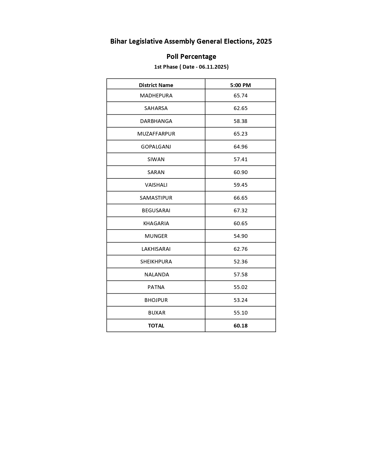 बिहार के मुख्य निर्वाचन अधिकारी के अनुसार, दोपहर 1 बजे तक मतदान प्रतिशत 42.31% रहा। इसमें सबसे ज़्यादा मतदान गोपालगंज ज़िले 46.73% दर्ज किया गया और पटना ज़िले में अब तक सबसे कम 37.72% मतदान हुआ।