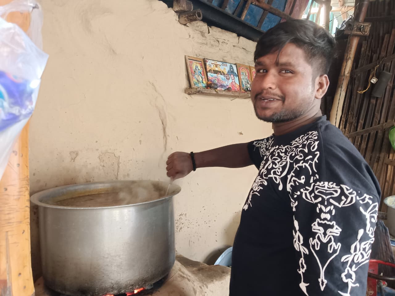 नीचे दी गई फोटो में दुकान पर कई लोग काम करते नज़र आ रहे हैं। हालांकि ये सभी सिर्फ हेल्पर नहीं हैं, बल्कि दुकान से जुड़े परिवार के सदस्य ही हैं। इन्हीं में से एक व्यक्ति, जो भगोने में कुछ चला रहे हैं, उनका नाम रोहन है।