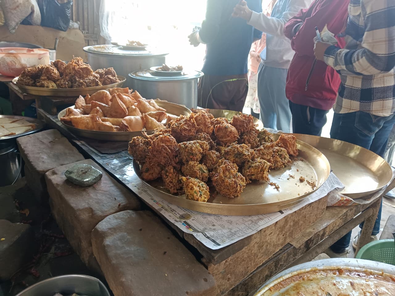 नीचे दी गई फोटो में आप देख सकते हैं कि दुकान में एक बड़ी सी प्लेट रखी हुई है, जिसमें पकौड़े जैसे दिखने वाले व्यंजन सजे हैं। इन्हें ही बचका कहा जाता है। यहाँ मुख्य रूप से दो तरह के बचका बनाए जाते हैं—चना का बचका और सब्ज़ियों का बचका।