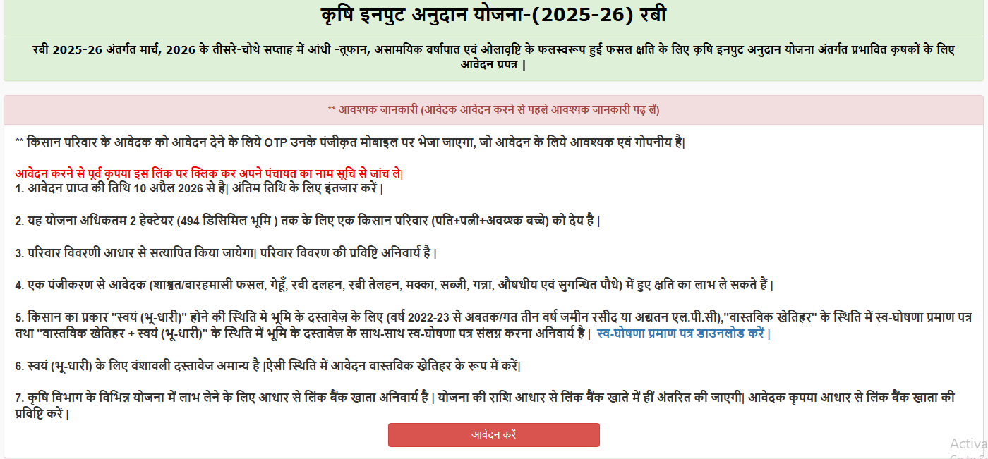 बिहार में जिन किसानों की फसल ख़राब हुई है वे ऑनलाइन आवेदन कर सकते हैं। आप https://dbtagriculture.bihar.gov.in/ इस पर सीधा क्लिक कर के वेबसाइट पर पहुंच जायेंगे। इसके बाद आपको ऑनलाइन सेवाएं का ऑप्शन दिखेगा। इस पर आपको क्लिक करना होगा इसके बाद दूसरा पेज खुलेगा। जो कुछ इस तरह दिखेगा। इसके बाद आप नीचे दिए गए आवेदन करें पर क्लिक करके फॉर्म भर सकते हैं। यह आवेदन आप 5 मई 2026 तक कर सकते हैं।