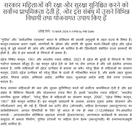वैसे तो केंद्र सरकार महिलाओं की सुरक्षा को सबसे ज़्यादा महत्व देती है। इसके लिए सरकार ने कई कानून और योजनाएं बनाई हैं। कानूनों में जैसे -भारतीय न्याय संहिता, भारतीय नागरिक सुरक्षा संहिता, घरेलू हिंसा से महिलाओं का संरक्षण कानून, 2006, दहेज निषेध कानून, 1961