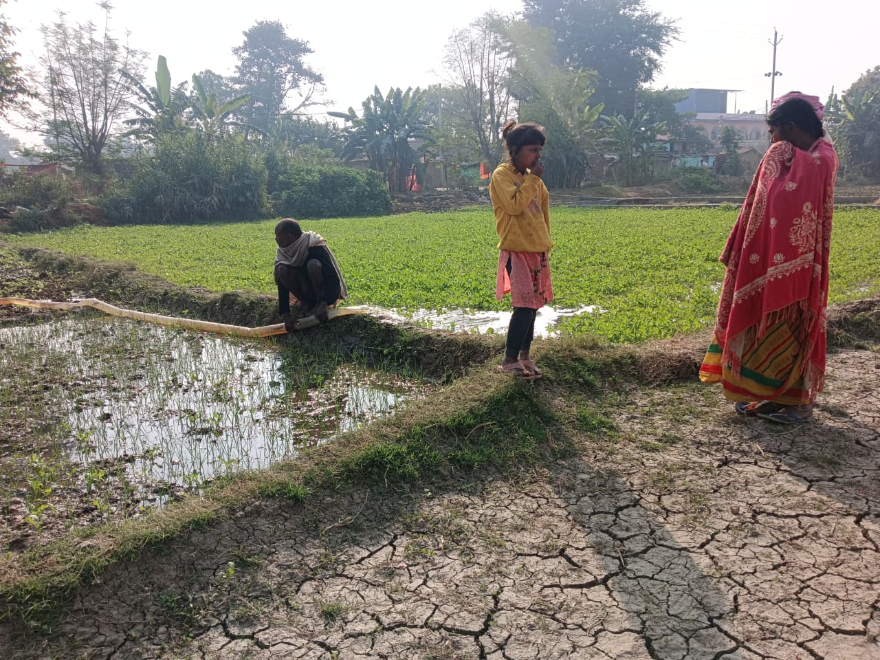 खेतों की पतली-सी मेड़ पर बैठे किसान पाइप को पकड़े हुए हैं। पाइप से तेज़ फोर्स के साथ पानी निकल रहा है और खेतों में पटवन (सिंचाई) हो रहा है। चारों तरफ नजर डालें तो केवल खेत ही खेत दिखाई देते हैं और सभी में पानी दिया जा रहा है।