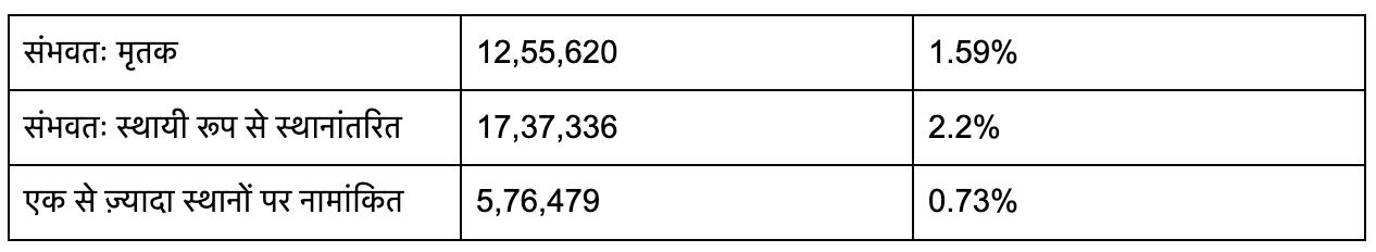 हालांकि, गणना प्रक्रिया के दौरान कई विसंगतियाँ सामने आई हैं, जिनकी अब समीक्षा हो रही है। बूथ स्तरीय अधिकारियों (बीएलओ) के तीन-तीन बार दौरे के बाद भी करीब 4.5% मतदाता — यानी 35,69,435 लोग — अपने सूचीबद्ध पते पर नहीं मिले।