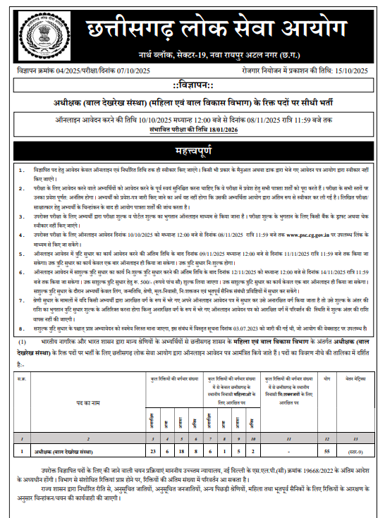 महिला एवं बाल विकासविभाग के अंतर्गत अधीक्षक (बाल देखरेख संस्था) के रिक्त पदों पर भर्ती के लिए छत्तीसगढ़ लोक सेवा आयोग द्वारा ऑनलाइन आवेदन आमंत्रित किया गया।