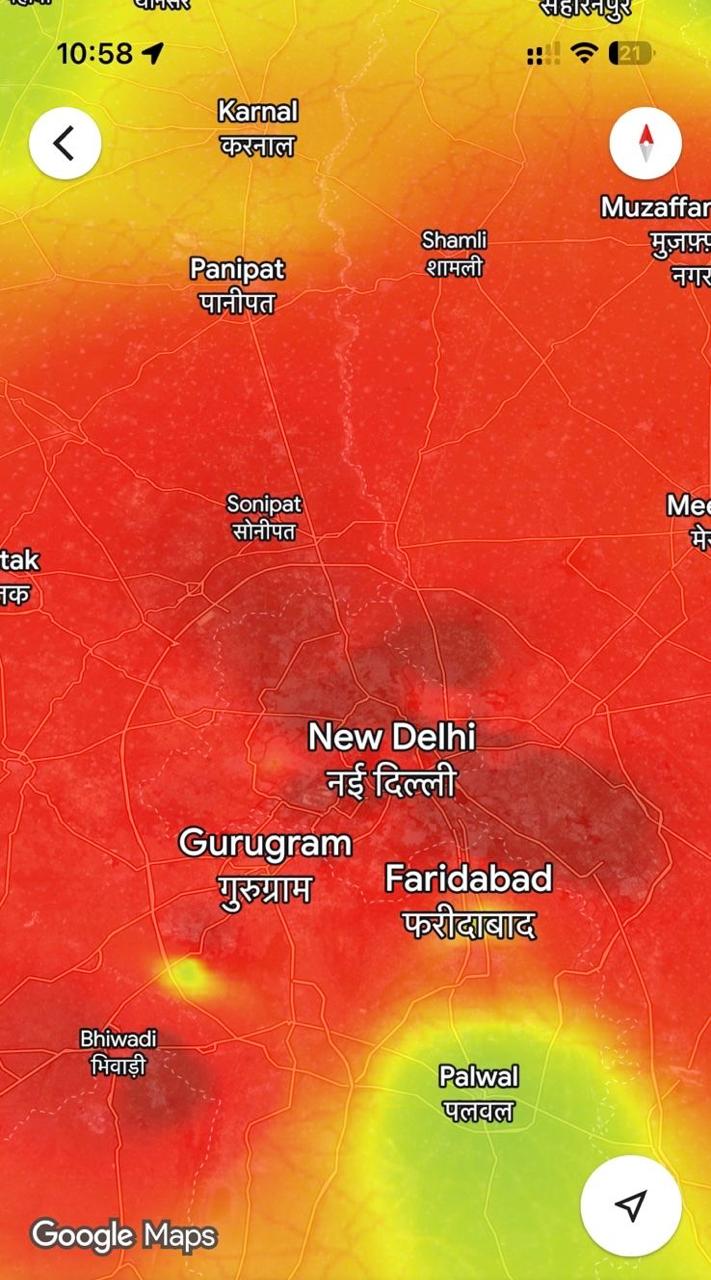 अगर मैप (नक़्शा) में देखें तो दिल्ली वर्तमान में लाल रंग में नजर आता है जो खतरे की निशानी है।