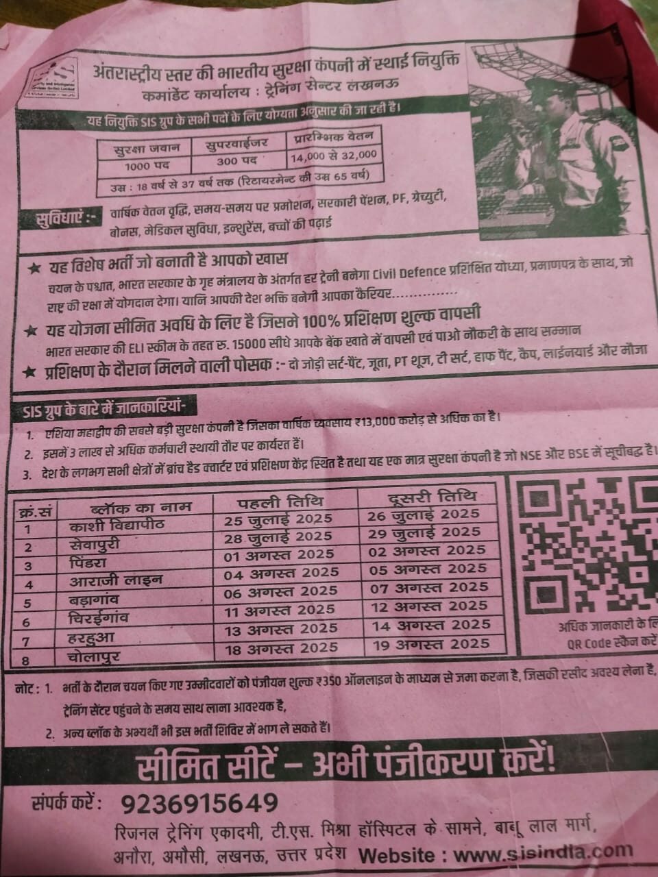 यह रोजगार कैंप काशी विद्यापीठ सेवा क्षेत्र के पिंडरा, आराजी लाइन, बड़ागांव, चिरईगांव, हरहुआ, चोलापुर सहित अन्य ब्लॉकों के युवाओं के लिए खोला गया है। कैंप में युवाओं की योग्यता के अनुसार SIS ग्रुप के सभी पदों के लिए की जाएगी। प्रशिक्षण और चयन प्रक्रिया कमांडो कार्यालय ट्रेनिंग सेंटर, लखनऊ के माध्यम से की जा रही है। सुक्षा जवान के 1000 पद और सुपरवाईज़र के 300 पद पर नियुक्ति होगी। इन पदों पर शुरुआत में वेतन 14000 से 32000 तक होगा। आयु सीमा 28 से 37 वर्ष रखी गई है, जबकि सेवानिवृत्ति की उम्र 65 वर्ष तक होगी।