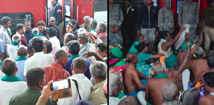 रेलवे स्टेशन का माहौल उस समय तनावपूर्ण हो गया जब ट्रेन से उतारे गए किसानों ने विरोध में अर्धनग्न होकर प्रदर्शन शुरू कर दिया। तमिल भाषा में लगाए जा रहे नारे पूरे प्लेटफॉर्म पर गूंज रहे थे। विरोध जताने वालों में सिर्फ पुरुष ही नहीं बल्कि महिलाएं और बुजुर्ग किसान भी शामिल थे।