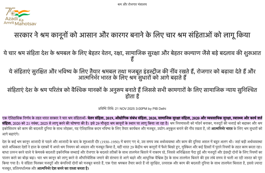 उन्होंने लिखा है “आज हमारी सरकार ने चार श्रम संहिताओं को लागू कर दिया है। यह आज़ादी के बाद से सबसे व्यापक और प्रगतिशील सुधारों में से एक है। यह हमारे श्रमिकों को अत्यधिक सशक्त बनाता है। यह अनुपालन को भी काफ़ी सरल बनाता है और ‘व्यापार करने में आसानी’ को बढ़ावा देता है।”