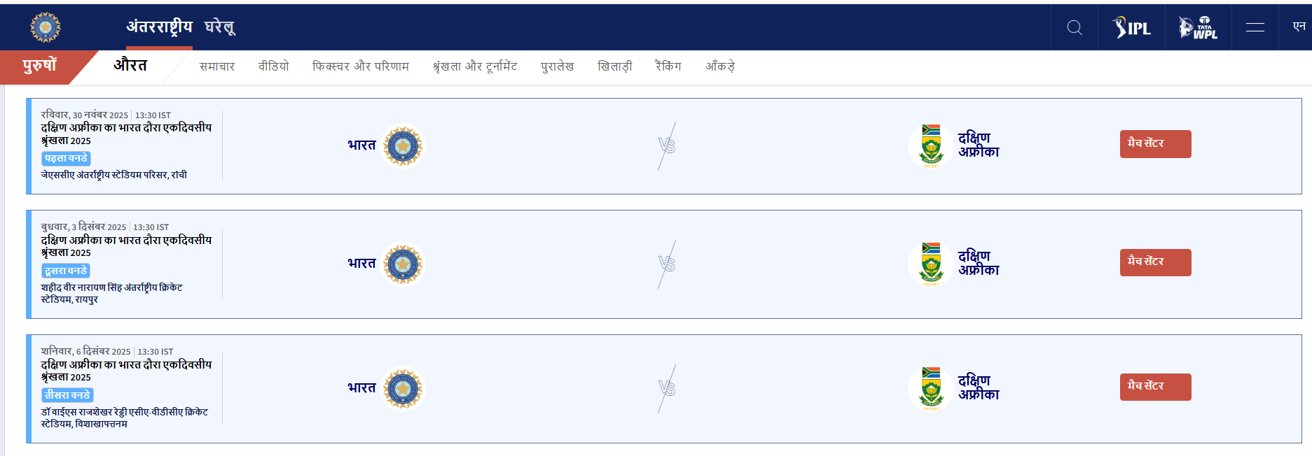 भारत और दक्षिण अफ्रीका के बीच वनडे मैच 30 नवंबर से शुरू होंगें। इसका अंतिम मैच 6 दिसंबर 2025 को खेला जायेगा।