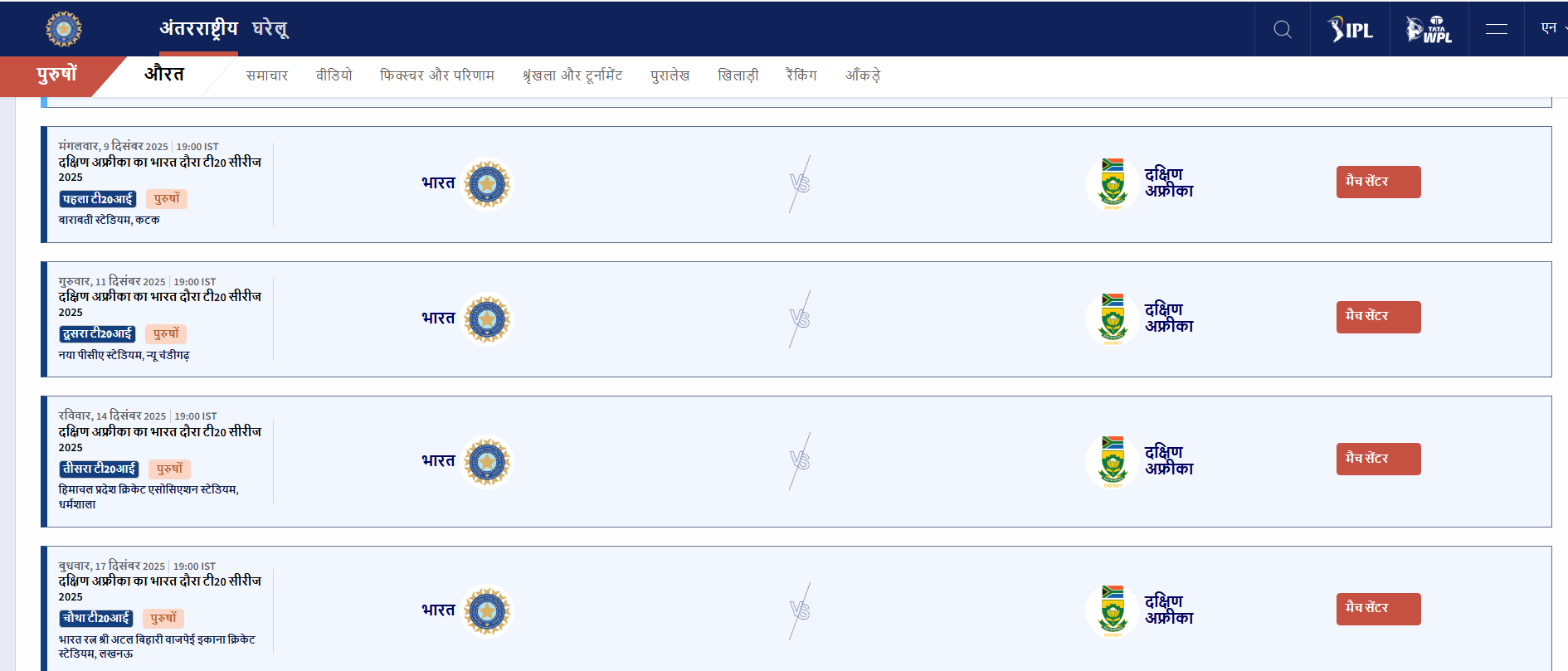 भारत और दक्षिण अफ्रीका के बीच पहला टी20 मैच 9 दिसंबर को खेला जायेगा। इस सीरीज का अंतिम मैच 19 दिसंबर 2025 को अहमदाबाद के नरेंद्र मोदी स्टेडियम में शाम 7 बजे खेला जायेगा।