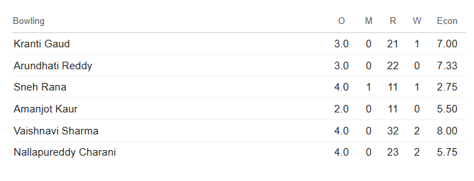 भारतीय टीम की तरफ से श्री चरानी ने 4 ओवर में 23 रन देकर 2 विकेट लिए वहीं स्नेह राणा ने 11 रन देकर 1 विकेट, क्रांति गौड़ ने 3 ओवर में 21 रन देकर 1 विकेट लिया। भारतीय गेंदबाजों ने श्रीलंका को 9 विकेट पर 128 रन पर रोक दिया। नीचे दिए गए टेबल में आप भारतीय गेंदबाज के ओवर, रन और विकेट देख सकते हैं।