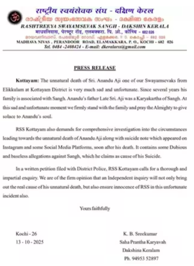 Moneycontrol के अनुसार कोट्टायम में जारी एक प्रेस बयान में आरएसएस दक्षिण केरलम के सह प्रांत कार्यवाह केबी श्रीकुमार ने इस निधन को दुखद और दुर्भाग्यपूर्ण बताया। उन्होंने पुष्टि की कि परिवार का संगठन से पुराना नाता था। हालाँकि उन्होंने नोट की प्रामाणिकता पर सवाल उठाते हुए इसकी सामग्री को संघ के खिलाफ संदिग्ध और निराधार आरोप बताया। श्रीकुमार ने बयान में कहा “आरएसएस उन परिस्थितियों की भी व्यापक जाँच की मांग करता है जिनके कारण यह अप्राकृतिक मृत्यु हुई। साथ ही इंस्टाग्राम पर सामने आए सुसाइड नोट की भी जांच की मांग करता है।” संगठन ने कोट्टायम पुलिस को एक औपचारिक याचिका सौंपी है जिसमें संगठन को “जानबूझकर और दुर्भावनापूर्ण रूप से फंसाने की कोशिश” का आरोप लगाया गया है जो संभवतः उसकी सार्वजनिक छवि को धूमिल करने की एक बड़ी साज़िश का हिस्सा है।
