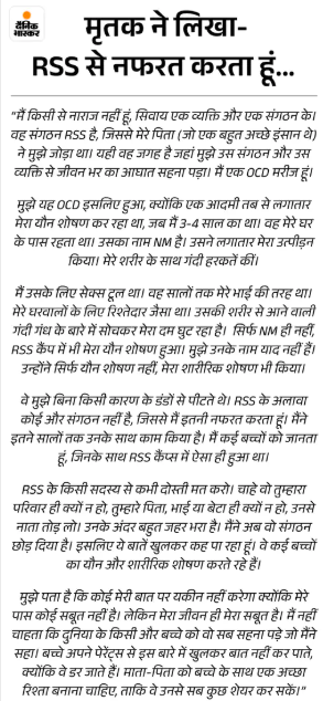 पोस्ट में लिखा था कि “मैं एक व्यक्ति और एक संगठन के अलावा किसी से नाराज नहीं हूं। वह संगठन है-RSS। जब मैं 3-4 साल का था तब पिता ने मुझे RSS से जोड़ा था। RSS कैंप्स में कई लोगों ने मेरा यौन शोषण किया। यही वह जगह है जिसने मुझे जीवनभर का सदमा दिया। सालों से डिप्रेशन और गंभीर मानसिक बीमारी से जूझने के बाद मैंने अब अपनी जान लेने का फैसला किया है।”
