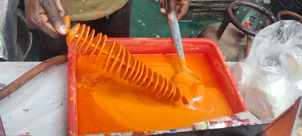 - आलू में एक लकड़ी की डंडी डाल दी जाती है, जिससे वह लंबाई में सुंदर ट्विस्टेड आकार में फैल जाता है।