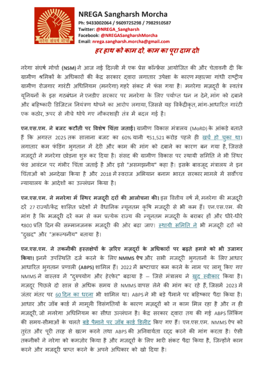 (NSM) जो मनरेगा मज़दूरों के स्वतंत्र यूनियनों और अधिकार संगठनों का गठबंधन है, ने साफ-साफ कहा कि सरकार की नजरअंदाज, कम बजट और डिजिटल नियंत्रणो की वजह से यह योजना अपने मूल मकसद से भटक रही है। मनरेगा मजदूरों ने साफ कहा कि वे रोज़ काम मांगते हैं, लेकिन उन्हें समय पर काम नहीं मिलता, जो काम मिलता है, उसकी मजदूरी बहुत कम है, वेतन महीनों तक अटका रहता है।