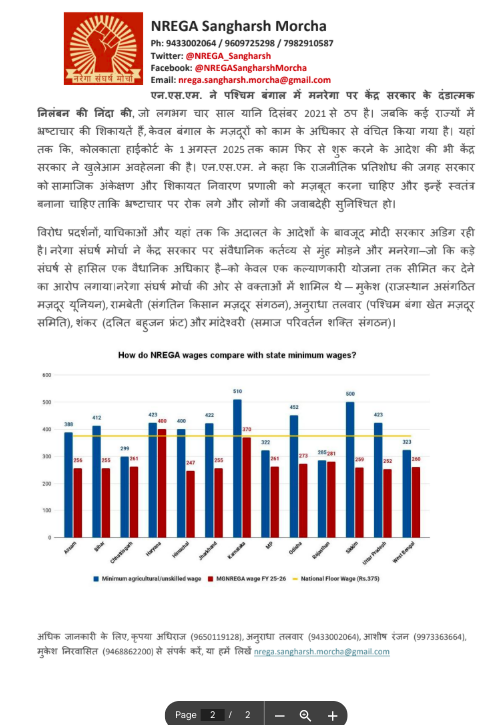 ग्रामीण विकास मंत्रालय के आंकड़ों का हवाला देते हुए, एनएसएम ने बताया कि वार्षिक बजट का 60 प्रतिशत ₹51,521 करोड़ अगस्त 2025 तक ही खर्च हो चुका है जिससे मजदूरी भुगतान में देरी हो रही है और काम की मांग कम हो रही है। मोर्चा ने यह भी कहा कि 27 राज्यों और केंद्र शासित प्रदेशों में मजदूरी अभी भी वैधानिक कृषि न्यूनतम मजदूरी से कम है। एनएसएम ने घोषणा की, “हमारी मांग स्पष्ट है प्रत्येक नरेगा मजदूर को कम से कम अपने राज्य का न्यूनतम वेतन मिलना चाहिए और सरकार को ₹800 प्रतिदिन के सम्मानजनक वेतन की दिशा में आगे बढ़ना चाहिए।”
