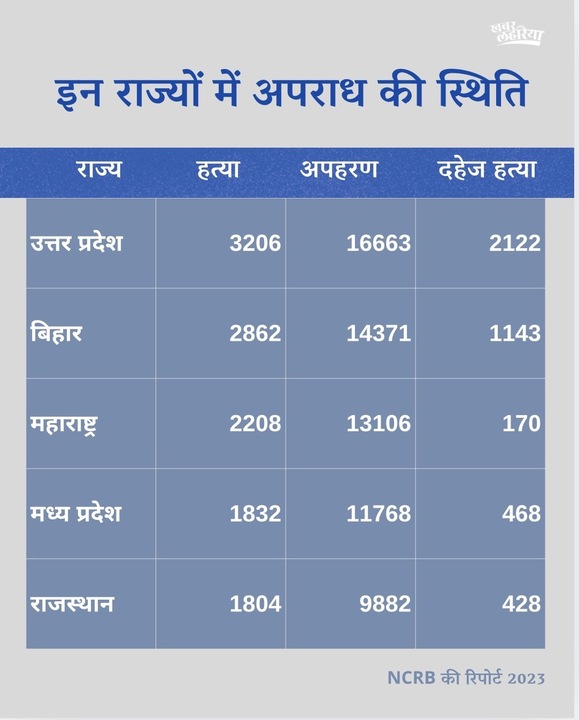 रिपोर्ट अनुसार हत्या और अपहरण के मामलों में उत्तर प्रदेश और बिहार सबसे ऊपर है। यानी गंभीर अपराधों की संख्या अन्य राज्यों की तुलना में इन दोनों राज्यों में सबसे अधिक है। 2018 का रिपोर्ट देखें तो पांच सालों में उत्तर प्रदेश में हत्या, अपहरण और दहेज हत्या के मामले घटे हैं। मध्य प्रदेश हत्या के मामले में 2018 की तुलना में मामूली कमी आई है, जबकि अपहरण और बंधक बनाने के मामले 2018 में 8596 थे, जो 2023 में बढ़कर 11,768 दर्ज किए गए हैं।