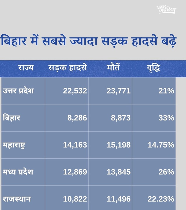 2023 एनसीआरबी के रिपोर्ट अनुसार सड़क दुर्घटनाओं के मामले में भी यूपी टॉप पर है जो राज्य में बढ़ती ट्रैफ़िक और सुरक्षा व्यवस्था की चिंताओं को दर्शाता है।