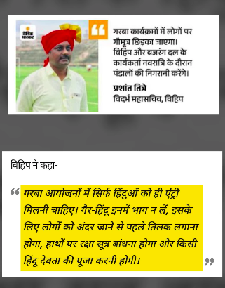 (BS) बिज़नेस स्टैंडर्ड के खबर अनुसार, बजरंग दल ने गुजरात में गरबा आयोजकों से अपने आयोजन स्थलों पर गैर-हिंदुओं के प्रवेश को रोकने को कहा है। उनका दावा है कि नौ दिनों तक चलने वाला नवरात्रि उत्सव हिंदू महिलाओं को लुभाने का मंच बन गया है।