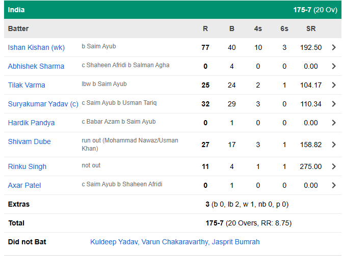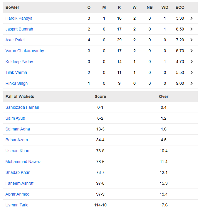 भारतीय टीम ने पाकिस्तान के सामने जीत के लिए 176 रनों का लक्ष्य रखा। लेकिन पाकिस्तान की टीम इस स्कोर का पीछा करने में शुरू से ही लड़खड़ाती दिखी। पाकिस्तान ने 13 रन पर ही अपने 3 विकेट खो दिए। जसप्रीत बुमराह, हार्दिक पांड्या, अक्षर पटेल, वरुण ने 2-2 विकेट और कुलदीप यादव, तिलक वर्मा ने 1-1 विकेट लिया। पाकिस्तान ने 18 ओवर में सिर्फ 114 रन बनाए और सभी विकेट गवा दिए।