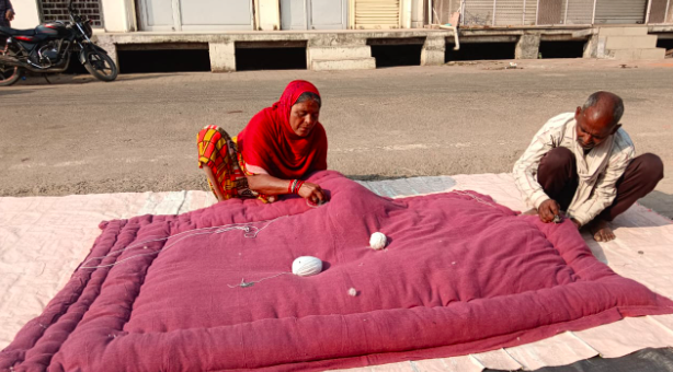 कर्वी के धतुरा चौराहा में 35 साल से रजाई तागने का काम कर रहीं सुंता बताती हैं कि जब उन्होंने यह काम शूरू किया था तब उन्हें दो रूपये रजाई ताग़ने और डेढ़ रूपये गद्दा ताग़ने के मिलते थे फिर भी खर्च निकल आता। दिनभर में चार-पांच से घंटे दो लोग मिलकर ताग़ लेते थे। अब अस्सी रूपये है फिर भी नहीं हो पाता मुश्किल से एक रजाई मिली दो लोगों ने मिलकर धागे भरे, 40-40 रूपये हुए। मंहगाई इतनी ज्यादा है सब्जी भी एक टाइम की 40 रूपए में नहीं होती है। सुंता के साथ ही एक ही रजाई में धागे भरे रहे मुन्ना ने बताया “अब लोग फैशन में हैं। लोग रजाई अब पसंद नहीं करते। सबके घर बड़ी-बड़ी कपड़े धोने की मशीन है। कंबल वो लेते हैं, रूई की गर्माहट कंबल में कहाँ है। फिर भी लोग कंबल पसंद करने लगे हैं। रूई तो वो नहीं भर सकते उसे मशीन तक ही लेकर आना पड़ेगा। ये भी एक कारण है गांव तक कंबल पहुंच गये हैं फिर भी किसान अभी रजाई भरवाते हैं। उन्हें रजाई की अहमियत पता है जो गर्मी रूई में है वो कंबल में नहीं। थोड़ा बहुत जो काम हमें मिल रहा है वो ग्रामीण क्षेत्र के लोगों की वजह से बचा है वरना रजाई गद्दे का चलन तो खत्म ही हो रहा है।”