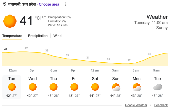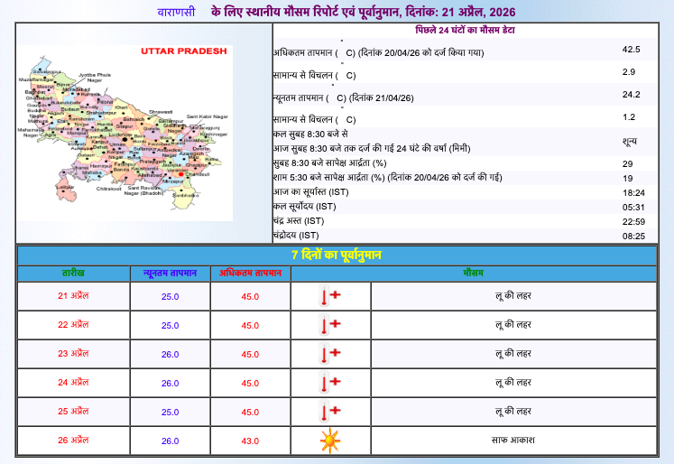 आज 21 अप्रैल के लिए वाराणसी समेत कई जिलों में हीटवेव का यलो अलर्ट जारी किया गया है। प्रयागराज और वाराणसी जैसे शहरों में पारा 42 से 44 डिग्री तक पहुंच चुका है जो सामान्य से काफी ज्यादा है। अनुमान है कि आने वाले पूरे हफ्ते वाराणसी में इसी तरह की तेज और झुलसाने वाली गर्मी बनी रहेगी।