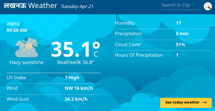 मौसम विभाग के मुताबिक 21 अप्रैल को पूर्वी और पश्चिमी यूपी में तेज धूप के साथ गर्म हवाएं चलेंगी। 22 अप्रैल को भी मौसम साफ रहेगा और लू चलने की संभावना है। 23 अप्रैल को पूरे प्रदेश में धूप और तेज हो जाएगी और हवा की रफ्तार कम होने से उमस भी काफी बढ़ेगी जिससे लोगों को ज्यादा परेशानी होगी।