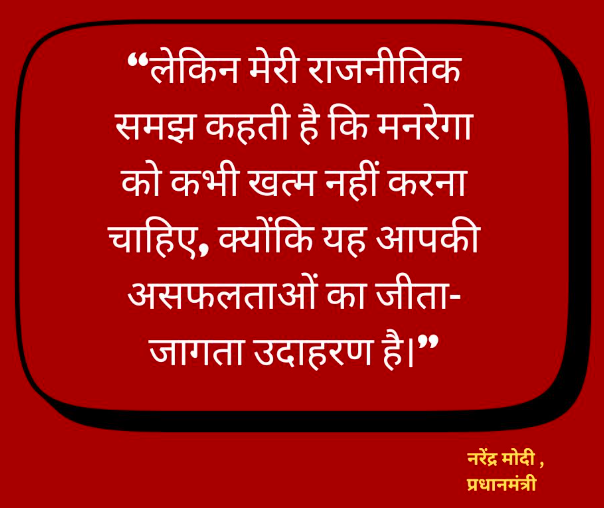 मोदी ने लोकसभा में कहा था, “मैं सुनता रहता हूं कि सरकार मनरेगा को खत्म करने जा रही है। लेकिन मेरी राजनीतिक समझ कहती है कि मनरेगा को कभी खत्म नहीं करना चाहिए, क्योंकि ये आपकी असफलताओं का जीता-जागता उदाहरण है। और मैं ढोल-नगाड़ों के साथ इसे दुनिया को दिखाता रहूंगा कि मनरेगा क्या है।”