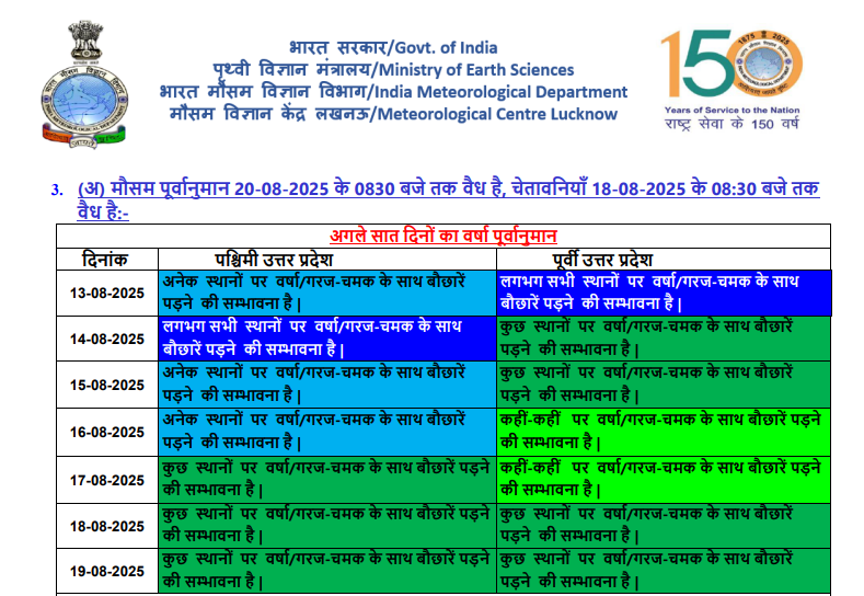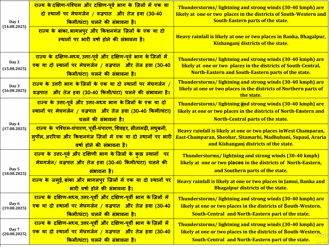 15–16 अगस्त: “सुबह‑दोपहर बहुत हल्की से हल्की बारिश/गरज-बरज; शाम/रात हल्की बारिश संभव।”