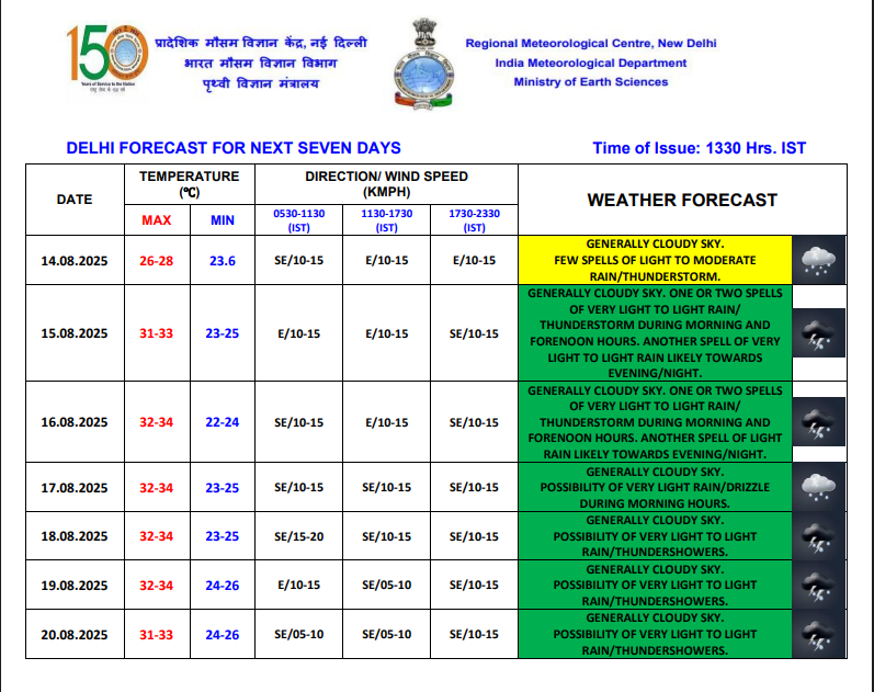14 अगस्त: “आकाश सामान्यतः बादलों से ढका रहेगा; हल्की से मध्यम बारिश/बिजली-गरज साथ, कुछ स्थानों पर भारी बारिश संभव।”