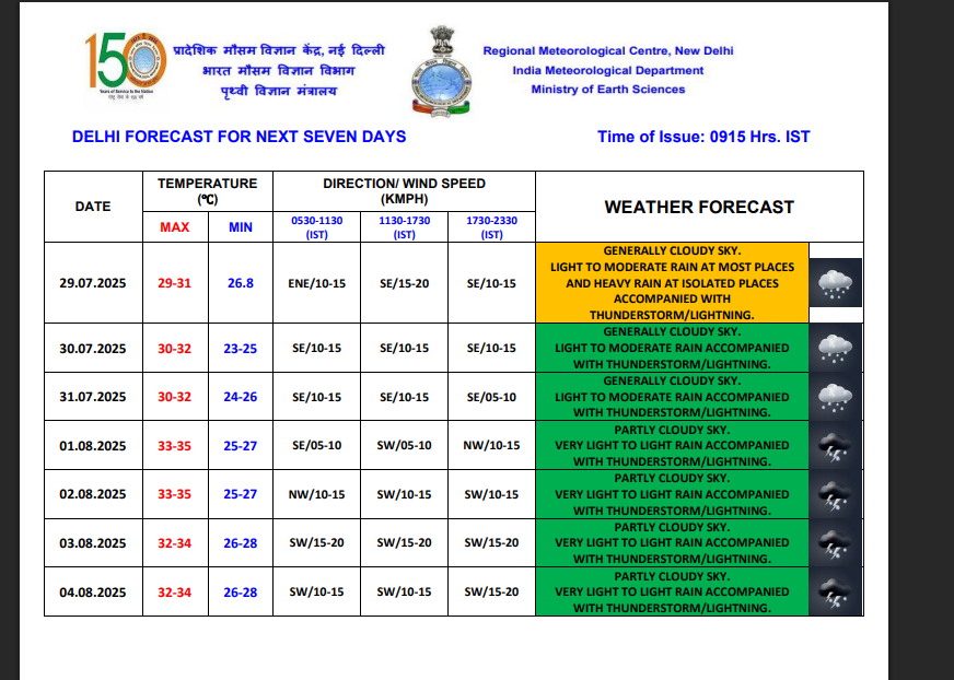 भारतीय मौसम विभाग (आईएमडी) ने 31 जुलाई से 3 अगस्त तक दिल्ली में बादल छाए रहने और बारिश और गरज के साथ बारिश की सम्भावना है। दिल्ली में 30 जुलाई और 31 जुलाई दो दिन तक तेज बारिश के साथ बिजली चमकने की भी सम्भावना जताई है।