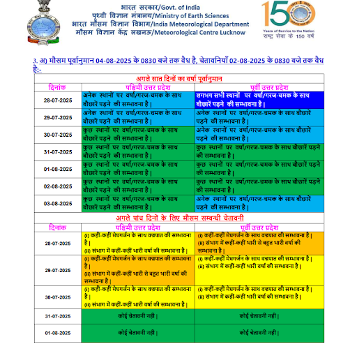 भारतीय मौसम विभाग के अनुसार आज 29 जुलाई 2025 से अगले 7 दिन यानी 3 अगस्त तक बारिश की संभावना है। आप उत्तर प्रदेश में मौसम की ताजा जानकारी के लिया यहां क्लिक करें।