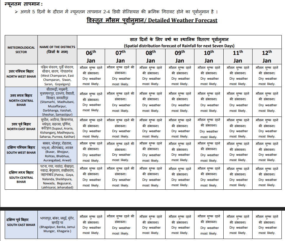 आपको बता दें कि आने वाले 2-3 दिनों में तापमान नीचे रहेगा, हल्की धूप मिलेगी लेकिन ठंड बनी रहेगी। बिहार में 7 जनवरी से 12 जनवरी तक मौसम शुष्क रहेगा और सुबह के समय घने कोहरे की सम्भवना है। आप आधिकारिक वेबसाइट पर जाकर मौसम अपडेट की जानकारी ले सकते हैं।