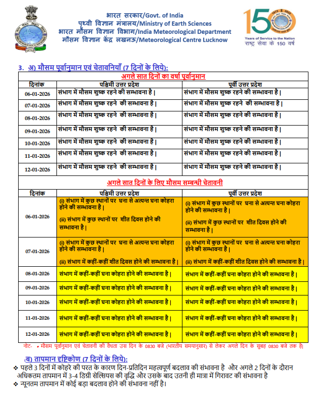 भारतीय मौसम विज्ञान लखनऊ के अनुसार 7 जनवरी से लेकर 12 जनवरी तक पश्चिमी और पूर्वी उत्तर प्रदेश में मौसम शुष्क और घना कोहरे रहने की सम्भावना है। आप इसकी जानकारी आधिकारिक वेबसाइट https://mausam.imd.gov.in/lucknow/mcdata/state.pdf पर क्लिक कर के देख सकते हैं।