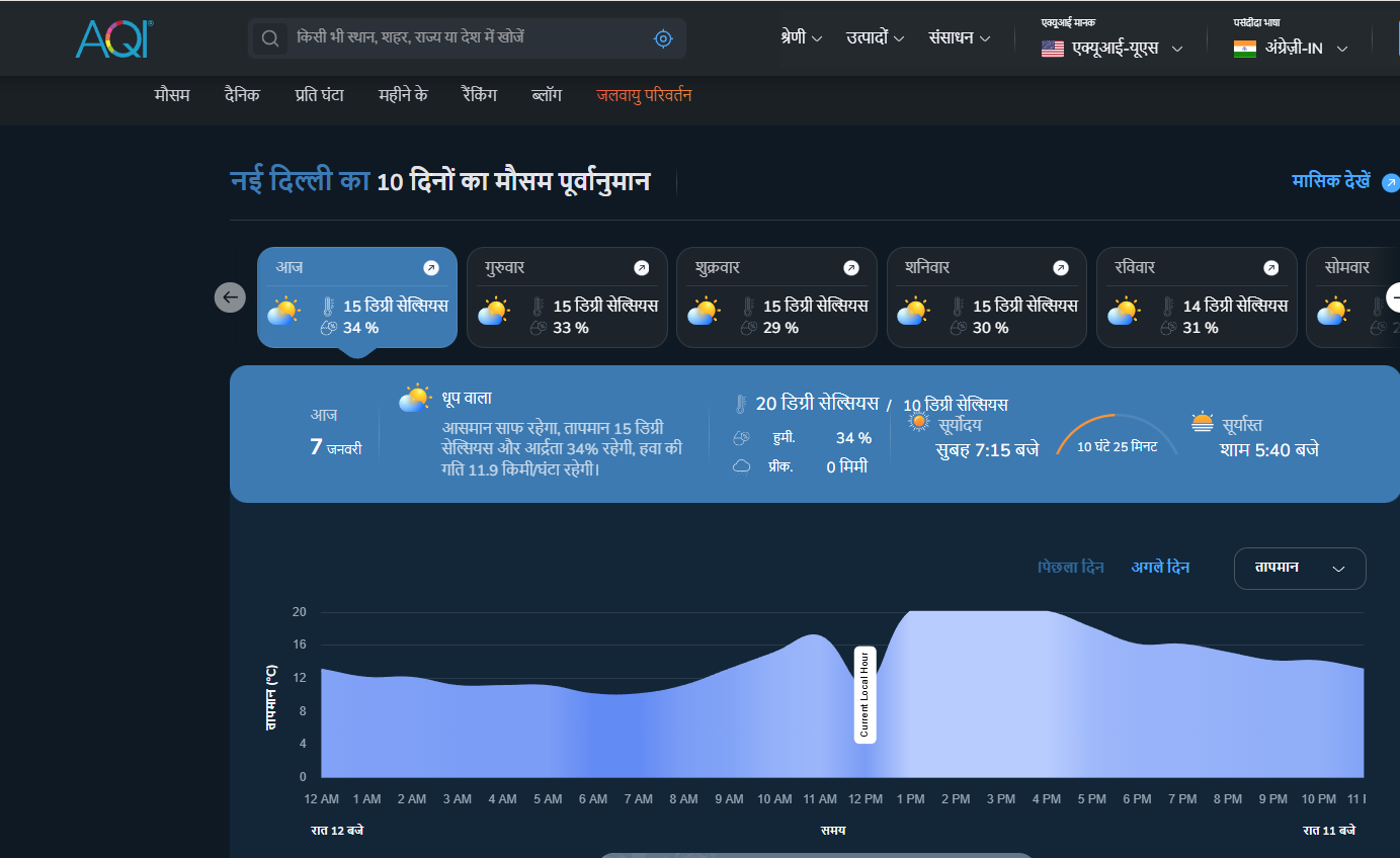 मौसम विभाग के अनुसार 7 जनवरी, 2026 को दिल्ली में ठंड का मौसम जारी रहेगा, न्यूनतम तापमान 5-7 डिग्री सेल्सियस और अधिकतम तापमान 16-18 डिग्री सेल्सियस के आसपास रहेगा। सुबह के समय हल्की से मध्यम धुंध छाने की संभावना है। दिल्ली में बढ़ते प्रदूषण के चलते वायु गुणवत्ता सूचकांक (AQI) में सुधार होकर यह खराब श्रेणी में आ गया है। आप एक्यूआई की वेबसाइट पर जाकर दिल्ली के मौसम के बारे में जानकारी ले सकते हैं।