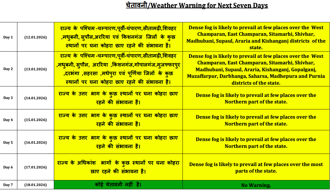 इस दौरान उत्तर बिहार में दक्षिण बिहार की तुलना में अधिक ठंड पड़ने की संभावना है। 14 जनवरी 2026 तक उत्तर बिहार के कुछ इलाकों में शीत दिवस और गहरे कोहरे की चेतावनी जारी की गई है। वहीं दक्षिण बिहार में सुबह के समय कोहरा छाए रहने के आसार हैं हालांकि दिन चढ़ने के साथ धूप निकल सकती है जिससे तापमान में थोड़ी बढ़ोतरी देखने को मिलेगी।