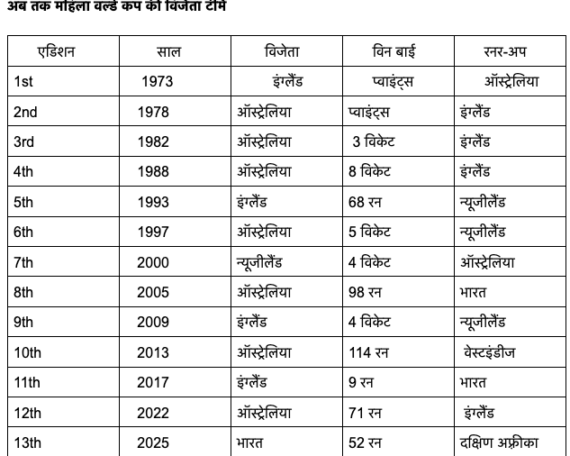 भारत के रूप में दुनिया को 25 साल बाद नया वर्ल्ड चैंपियन मिला। भारत ने इससे पहले 2005 और 2017 महिला वनडे वर्ल्ड कप के फाइनल में प्रवेश किया था लेकिन ट्रॉफी जीतने से चूक गई थी।