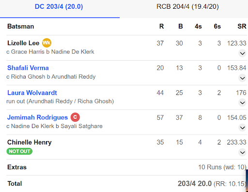 दिल्ली कैपिटल्स टीम की शुरुआत धीमी रही लेकिन कप्तान जेमिमा रॉड्रिग्स ने 37 गेंदों में 57 रन बनाए वहीं 4 वोल्वार्ड्ट 44, ली 37, हेनरी 35 रन बनाए। इन तीनों खिलाड़ियों की बदौलत कैपिटल्स टीम ने RCB को जीत के लिए अब तक सबसे बड़ा स्कोर 4 विकेट खोकर 204 रनों का लक्ष्य दिया।