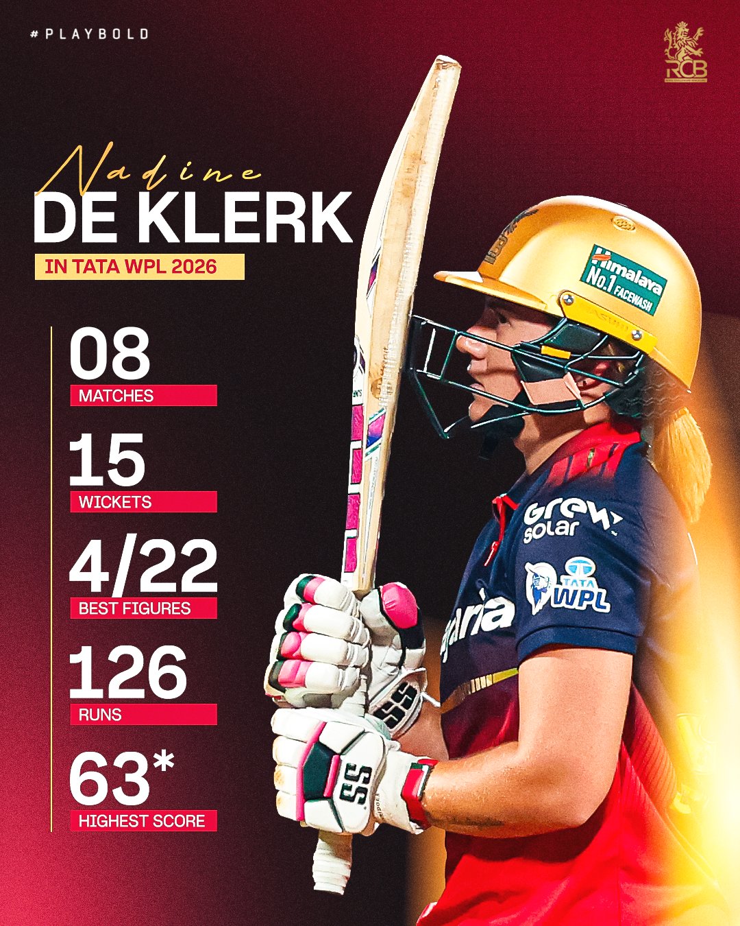 रॉयल चैलेंजर्स बेंगलुरु की टीम की बेहतरीन बल्लेबाज और गेंदबाज खिलाड़ी नादीन डी क्लर्क (Nadine de Klerk) (फोटो साभार : X/@wplt20)